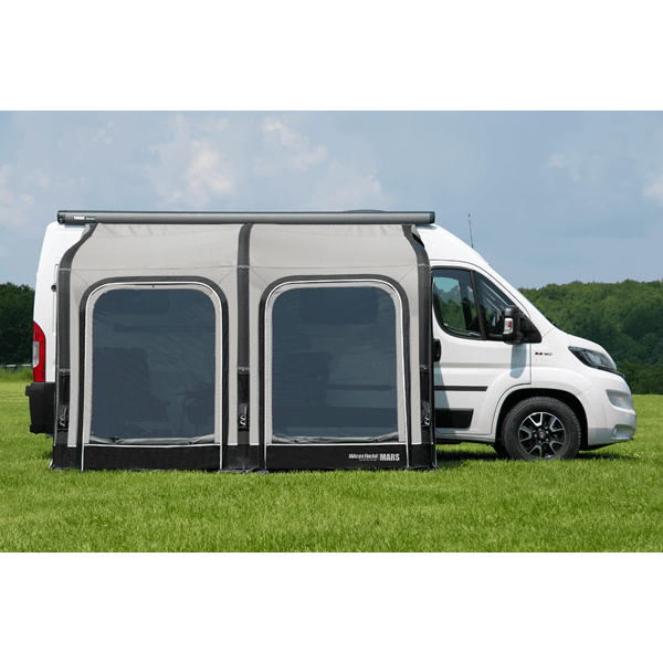 Optimalt utnyttjande av utrymme, hög funktionalitet, perfekt form kännetecknar lufttältet Mars Van som är anpassat för van. Lufttältet har ett djup på 250 cm och är tillverkat i HydroTech® ripstop-material med polyuretanbeläggning som ger en påtaglig ”soft touch”-känsla. Sidoväggarna har en dörr och ett fönster med myggnät. Fronten har två stora avtagbara fönster. Markmått: 330 x 250 cm.