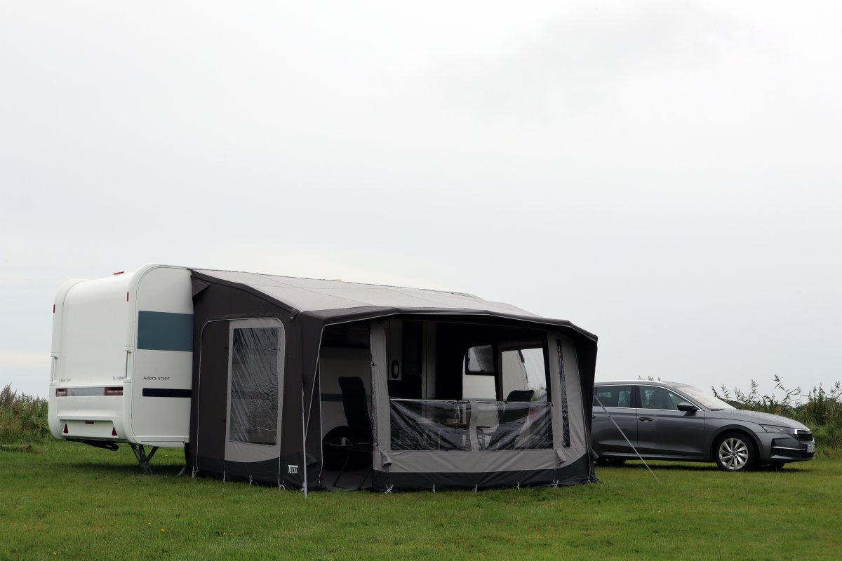 Telta Scenic är ett lyxigt förtält som kombinerar stil och komfort. Med sin fina design, stora panoramafönster och eleganta former ger det en ljus och rymlig känsla.