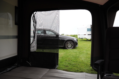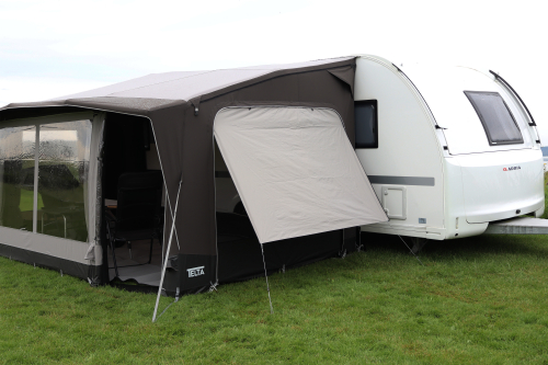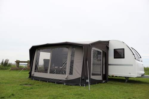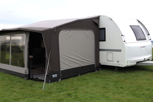 Detta tält kan monteras i husvagnsskenan och i husbilens boxmarkis.