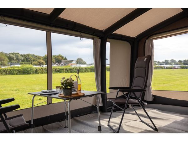 Du kan njuta av vackra vyer genom det stora mittfönstret och känna dig avslappnad i den lugna atmosfären. Förtältet har även praktiska dörrar som gör det enkelt att komma in och ut.