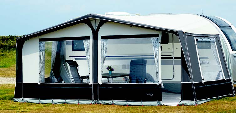 Front- och gavelstycken är nedfällbara och avtagbara. För extra ventilation är Ventura D försett med myggnätsfönster med folieklaff i den ena gaveln. Ventura D har en färgsättning i eleganta grå nyanser.