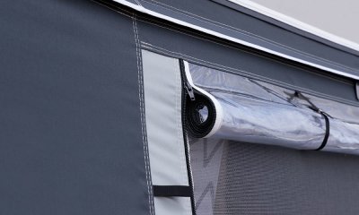 Front- och gavelstycken är nedfällbara och avtagbara. För extra ventilation är Ventura D försett med myggnätsfönster med folieklaff i den ena gaveln. Ventura D har en färgsättning i eleganta grå nyanser.