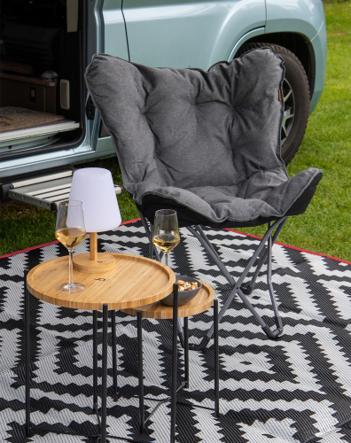 Otroligt bekväm och skön stol i kraftig Oxford polyester i linnelook. Kraftig stålstativ i pulverlackad antracit. Lätt att fälla ihop och packa ner i den medföljande väskan. 3,5 kg. Tål 100 kg belastning.