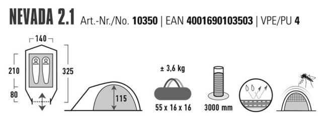 Genomskinliga foliefönster släpper in ljus i interiören. Mycket stabila markpinnar i stål med 5 mm diameter som inte böjer sig ens på hårt underlag. Mörkt innertält håller ljuset ute för de som vaknar sent. Vario Vent Control System med gasbindning håller irriterande insekter borta och kan bekvämt manövreras från insidan beroende på klimatet. Täckfliken kan enkelt förvaras i en ficka. Innertältfickor för redskap och en lamphållare för en campinglykta eller ficklampa avrundar komforten. Nevada 2.1 erbjuder plats för 2 personer med bagage. Perfekt för weekendcamping. Lätt att sätta upp.