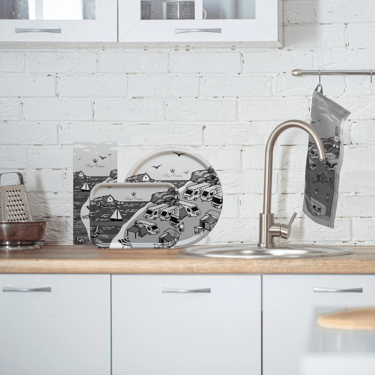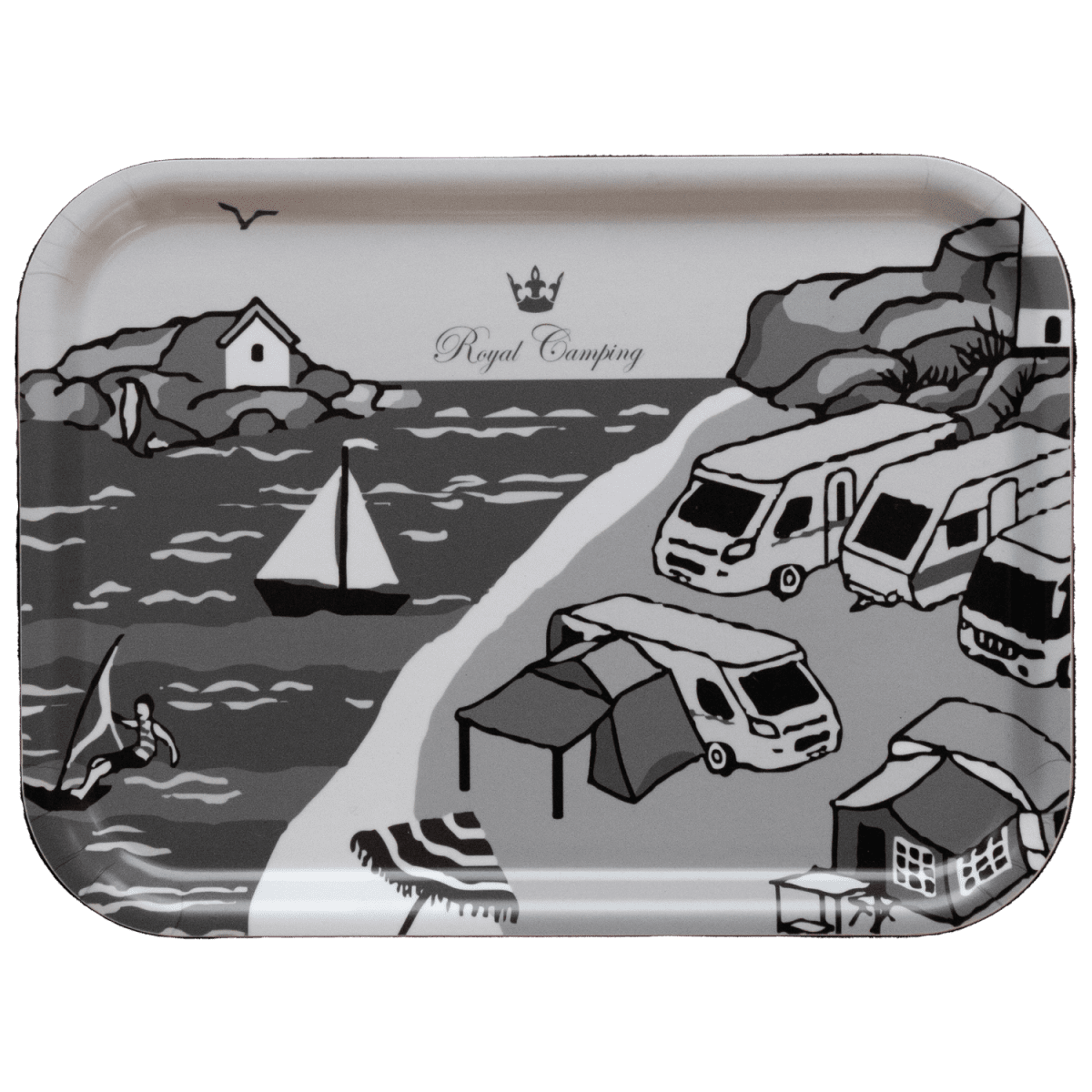 Svenskproducerad bricka med campingmotiv.