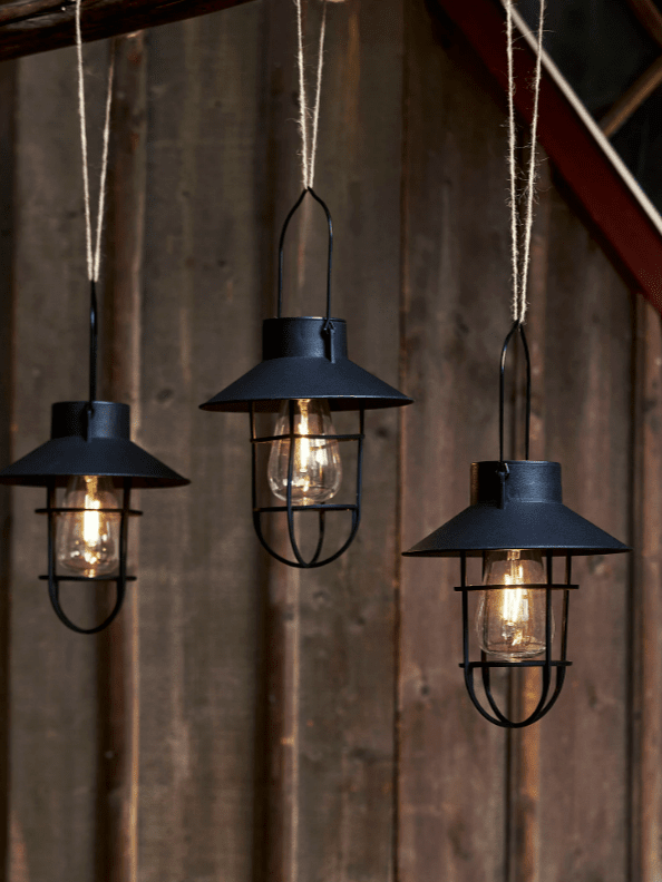 Räjäl lampa för att hänga upp. 2x18 varm vita led som drivs av det solcellsuppladdningsbara batteriet. Kommer blandat i brons/svart och grön/svart färg.
