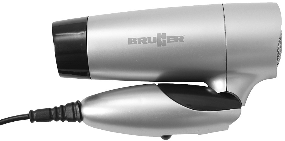 Kompakt hårtork för resan med ett fällbart handtag för att spara plats. Kan drivas med 230V eller 110V spänning.